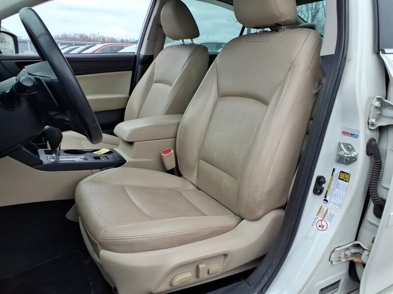 Factory-equipped features you’ll appreciate: - Powertrain & drivetrain: 2.5L horizontally opposed 4-cylinder engine (175 hp, 174 lb-ft) with continuously variable transmission (CVT) and Subaru Symmetrical All-Wheel Drive for strong all-weather traction. - Comfort & seating: Warm Ivory leather-trimmed seats, heated front seats, and a supportive power-adjustable driver’s seat with lumbar support for long-drive comfort. Spacious rear seating with generous legroom and folding rear seats for added cargo flexibility. - Climate & convenience: Dual-zone automatic climate control to keep driver and passenger comfortable, power windows and door locks, cruise control, and remote keyless entry. - Exterior & lighting: Elegant Crystal White Pearl paint, alloy wheels, fog lights and automatic headlights that make evening driving easier and safer. - Infotainment & connectivity: Factory-installed Subaru audio system with AM/FM, CD player, Bluetooth hands-free calling and audio streaming, USB and auxiliary inputs for your devices, and steering-wheel audio/phone controls for safe, convenient operation. - Interior touches: Leather-wrapped steering wheel, tasteful chrome trim accents, and easy-to-clean surfaces that keep the cabin feeling fresh. - Safety & driver aids: Standard safety suite including ABS brakes, electronic stability control, traction control, and a full complement of airbags (front, side and curtain) plus a tire pressure monitoring system and a rear backup camera for easier parking and reversing.
